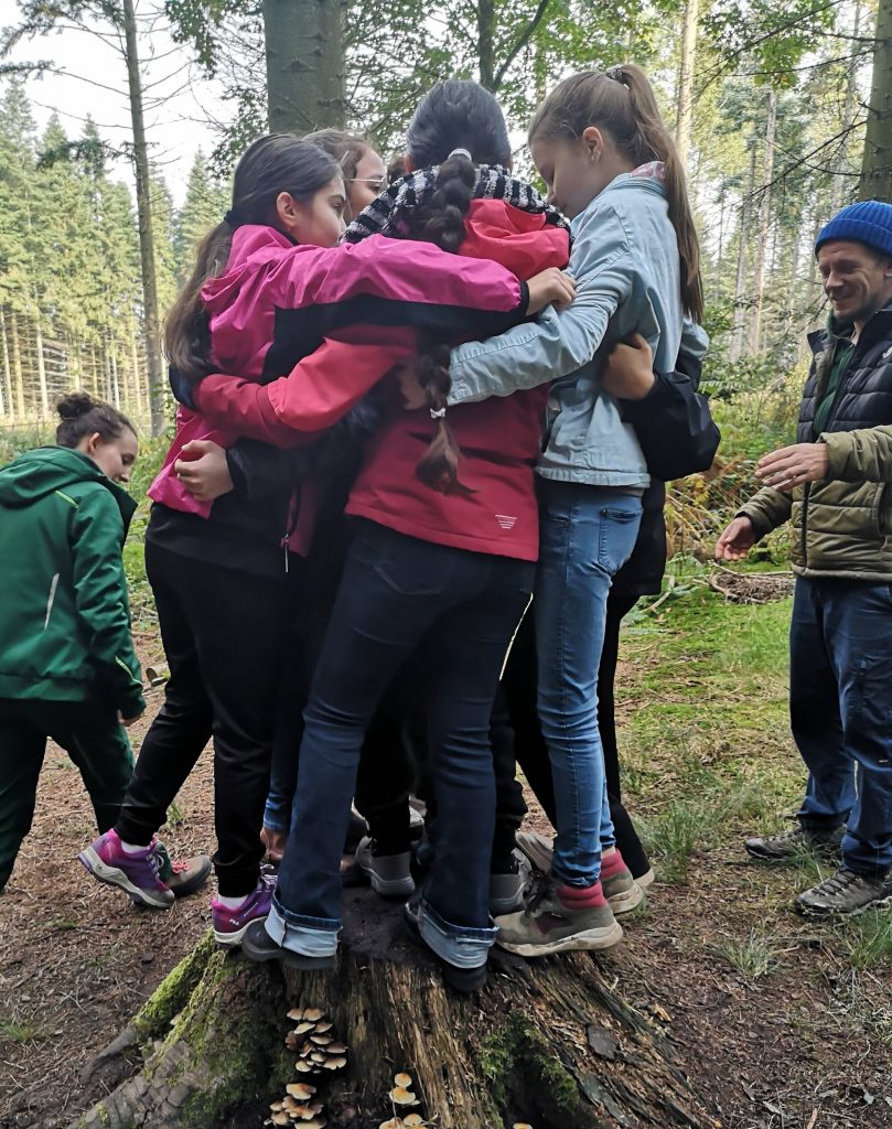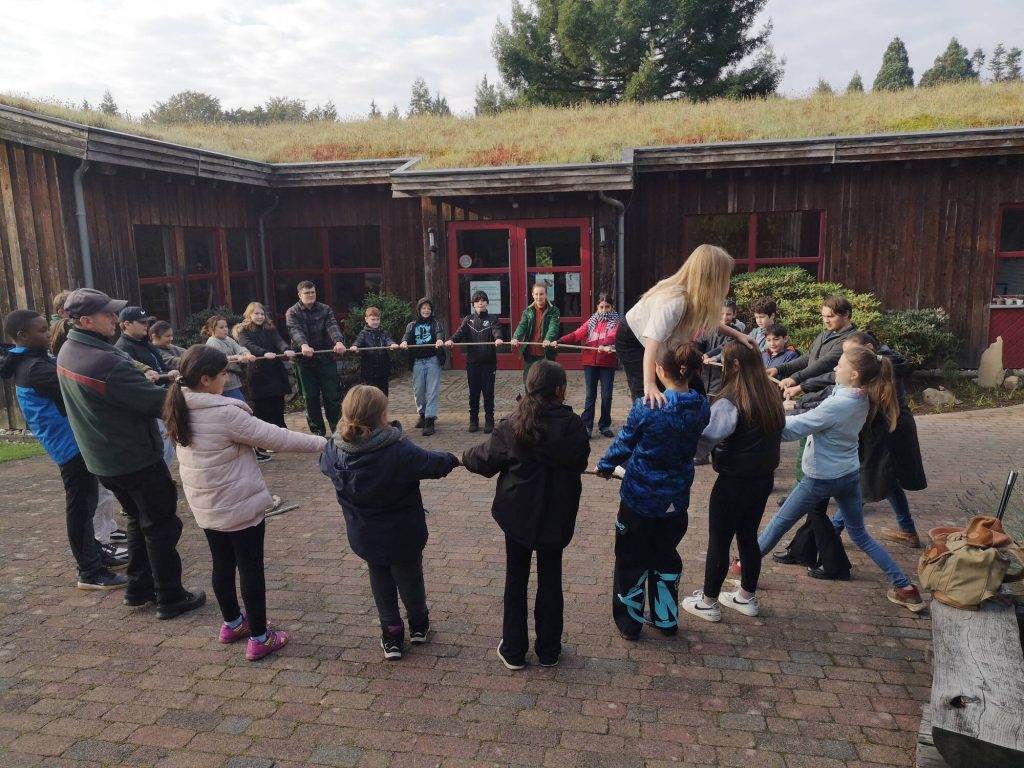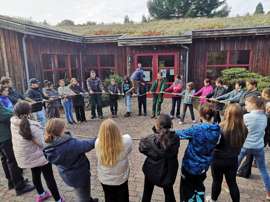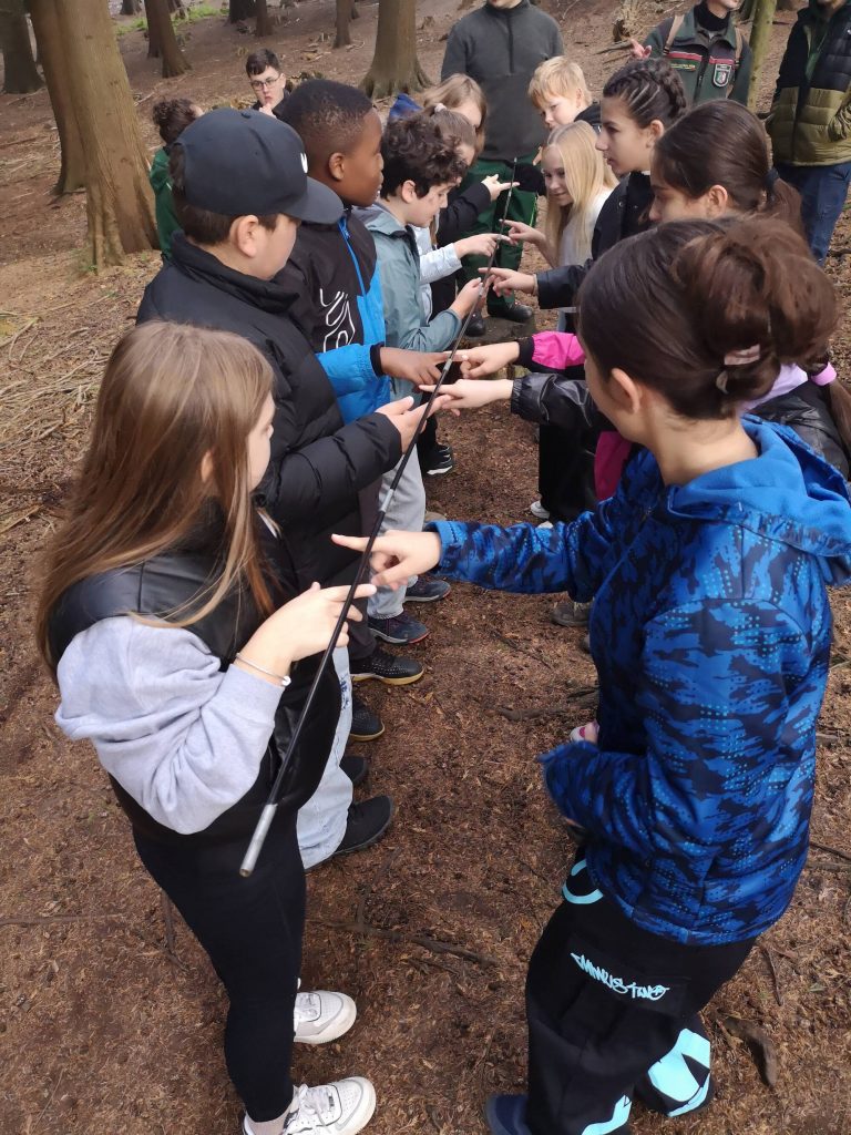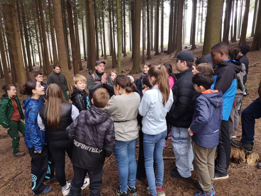 „Im Team raus in den Wald“ hieß es wie jedes Jahr wieder für die sechsten Klassen. Bei kleinen Teamspielen in der Natur erfuhren die Schülerinnen und Schüler gleichzeitig allerhand Wissenwertes zum Thema Wald. Vielen Dank an Dirk Wagenführ vom Waldpädagogischen Zentrum Burgholz, der diesen teamerlebnisorientierten Waldspaziergang angeleitet hat. Viele der Spiele wurden verknüpft mit den Gegebenheiten in der Natur, so dass neben dem Spaß und der Entwicklung der Teamfähigkeit in der Klasse auch die Kenntnisse zum Thema Wald erweitert wurden.