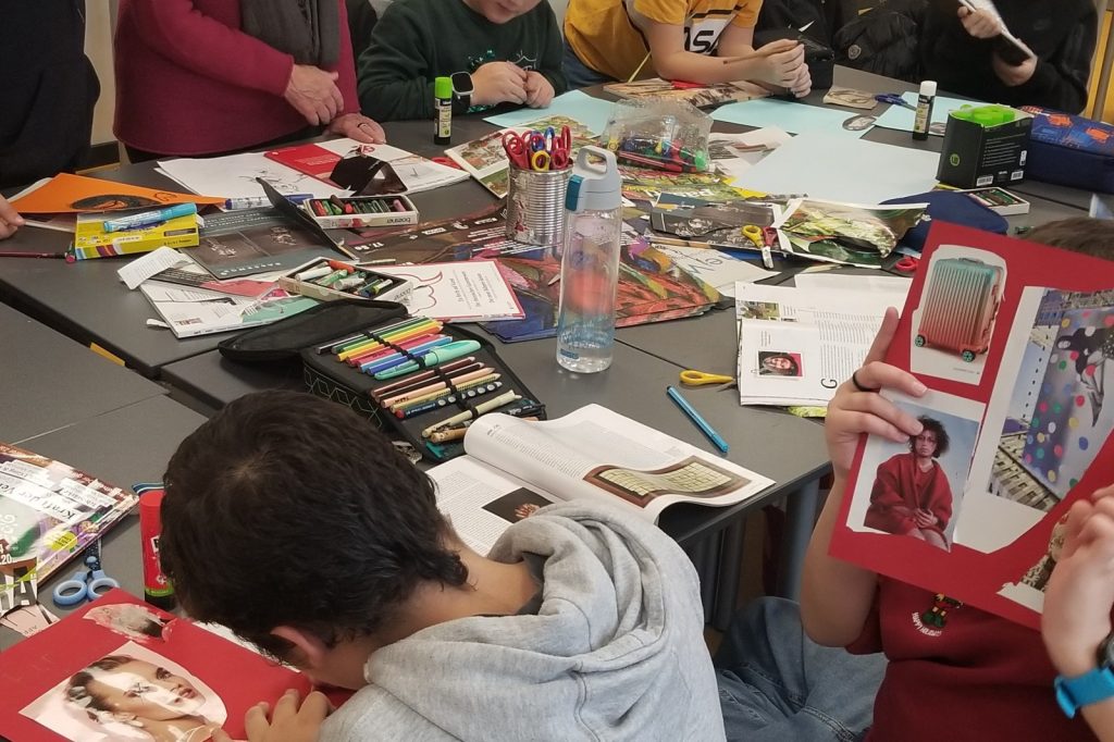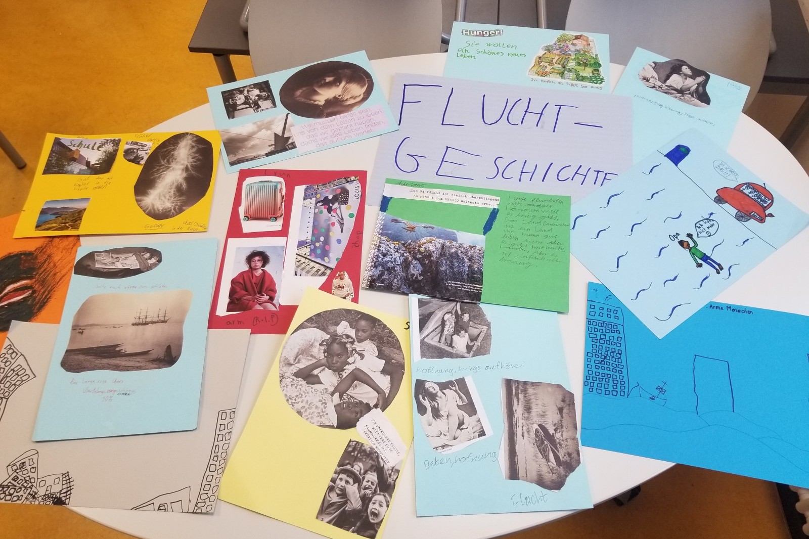 Workshop in der 5c zum Thema Fluchtgeschichten, eine Lesung organisiert vom Kommunalen Integrationszentrum mit anschließender Kunstaktion mit Mitarbeitern des Von-der-Heydt Museums.