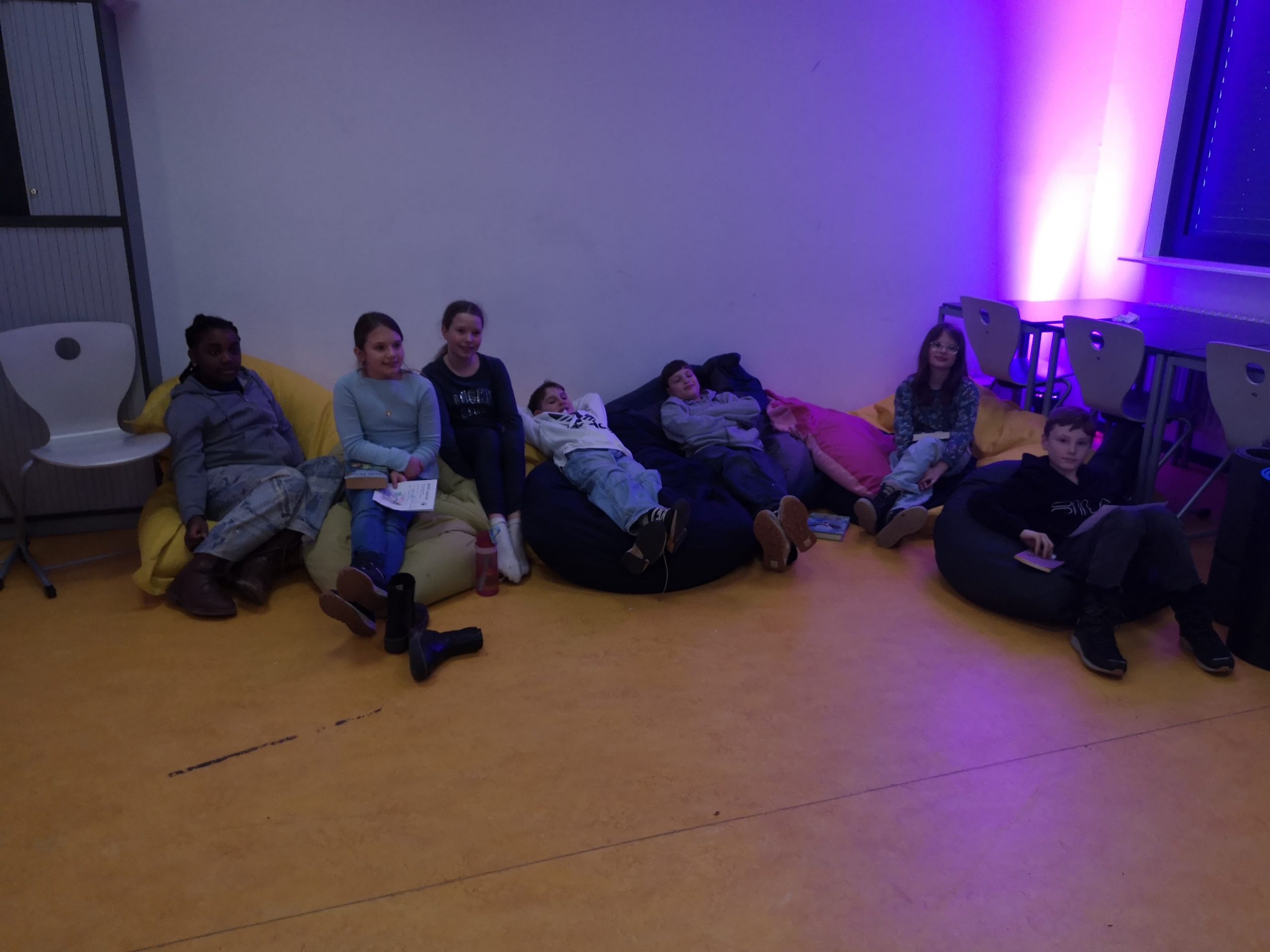 Sie bastelten Lesezeichen, stellten sich gegenseitig ihre Lieblingsbücher vor oder hörten – gemütlich in Sitzsäcke gekuschelt – einer Lesung zu. Die Fachschaft Deutsch hatte eingeladen und einige Kolleg/innen lasen gerne vor. Ein kleines Snackbuffet, das die Eltern beigesteuert hatten (vielen Dank für die üppige Unterstützung!), bot zwischendurch eine Stärkung und nach drei Stunden verließen die Jungen und Mädchen die inzwischen ruhig gewordene Schule. Die eine oder der andere hatte im Gepäck einen neuen Buchtipp für die nächsten Wochen. Vielleicht kann man die Bücher ja sogar in unserer Schülerbücherei bekommen.