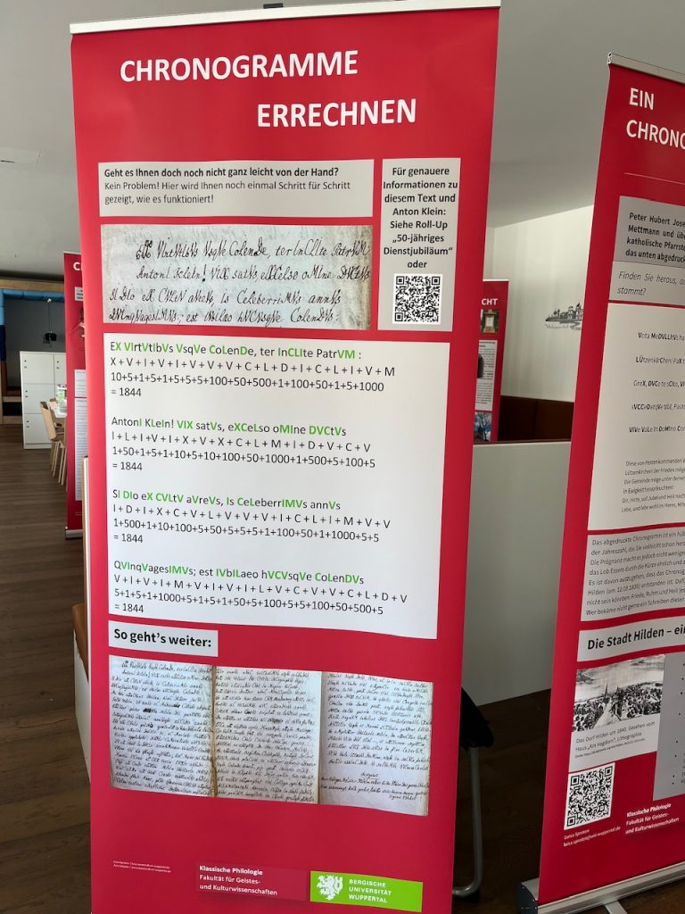 Neben diesem Forschungseinblick gab es aber auch einen interessanten Workshop zu sogenannten „Chronogrammen“ – kleinen lateinischen Texten, in denen durch die römischen Zahlzeichen Jahreszahlen versteckt werden und die so einen gewissen Rätselspaß garantieren (und das, obwohl es sich um Latein handelt?). Die Zeit bis zum Mittag verging für uns sehr schnell und wir haben den Besuch nicht bereut.