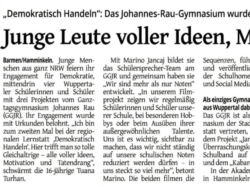 - „Demokratisch Handeln“ – GGJR ist dabei!Eine starke Delegation unserer Schule war auch in diesem Jahr wieder bei der Lernstatt @demokratisch_handeln in der @akademieklausenhof. Als einzige Schule Wuppertals nahm das GGJR… „Demokratisch Handeln“ – GGJR ist dabei! weiterlesen